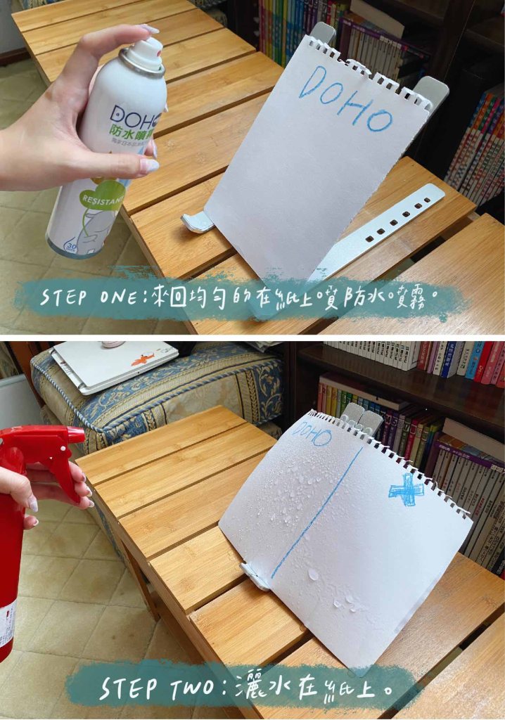 入手DOHO 嘟后商品前看到官網上分享的防水噴霧相關文章我才知道,原來防水噴霧的原理是荷葉效果,就是在織品上面形成微結構的纖毛,產生水珠狀的防水效果。