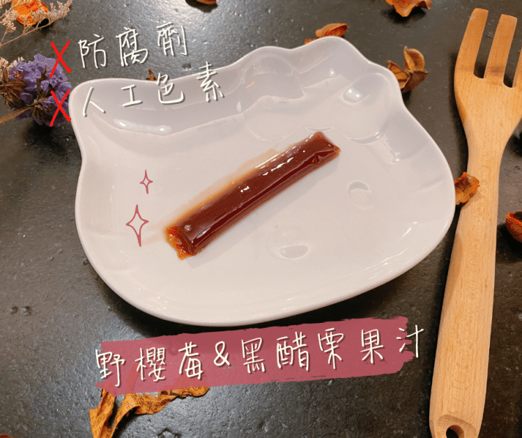 因為黑醋栗跟野櫻莓果汁的關係,凍條本身顏色呈現非常漂亮且天然的深紅色,有點像紅寶石的感覺~