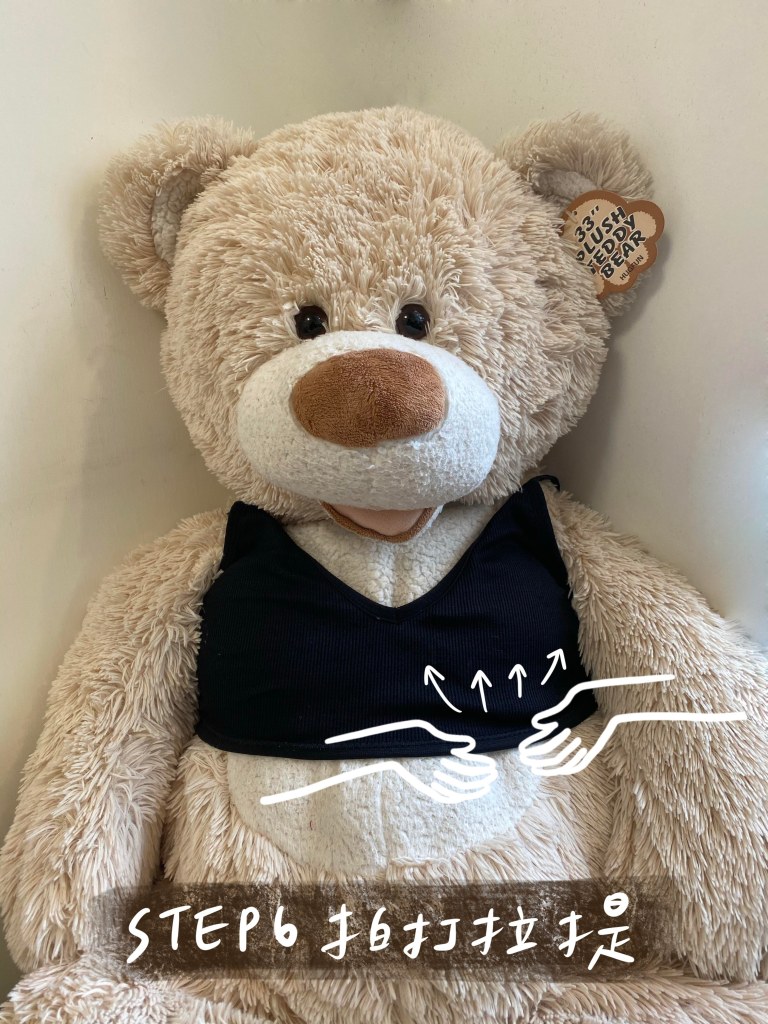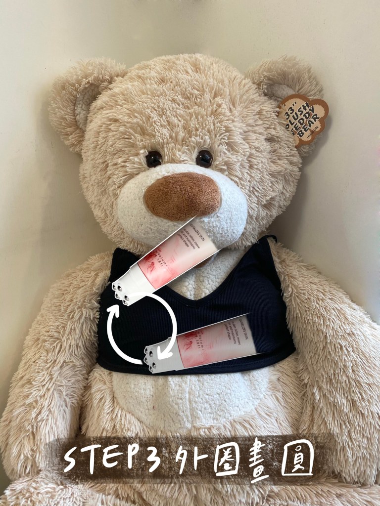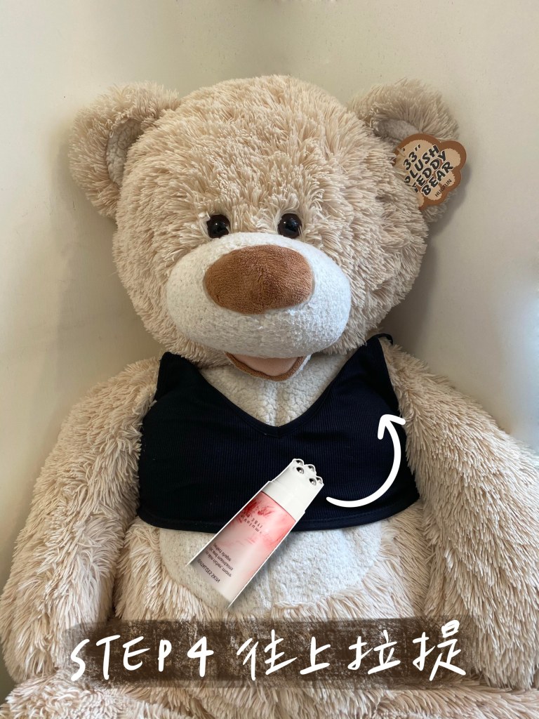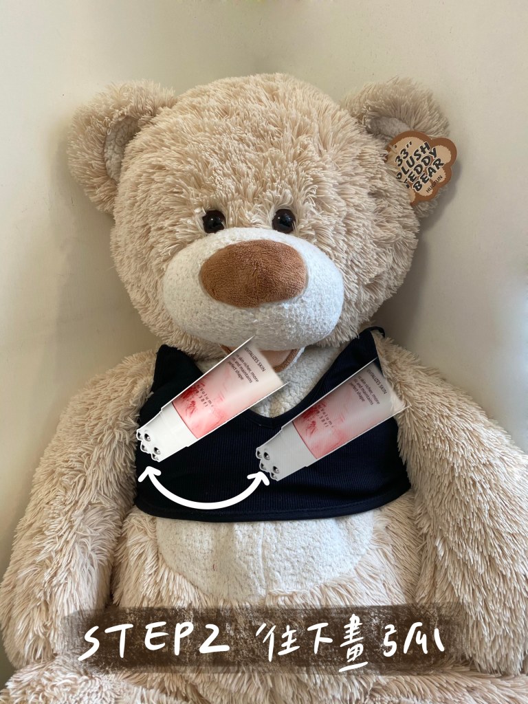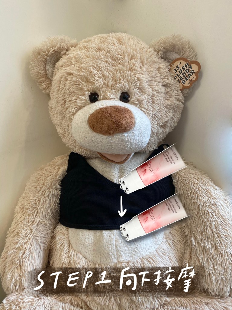 避開咪咪點,一手拿著美巨霜由下往上推壓胸部至鎖骨下方,每邊約推壓大約10次。