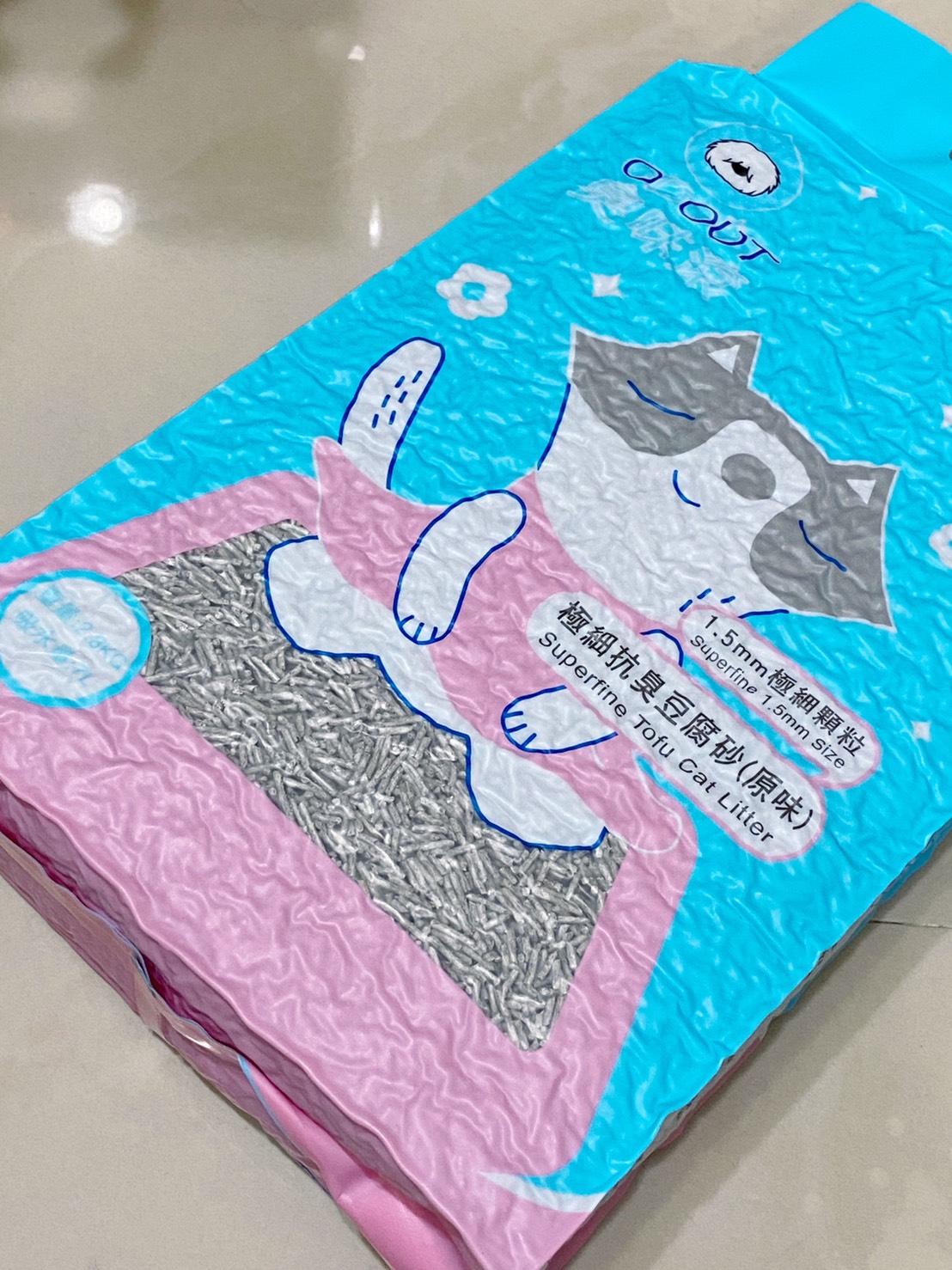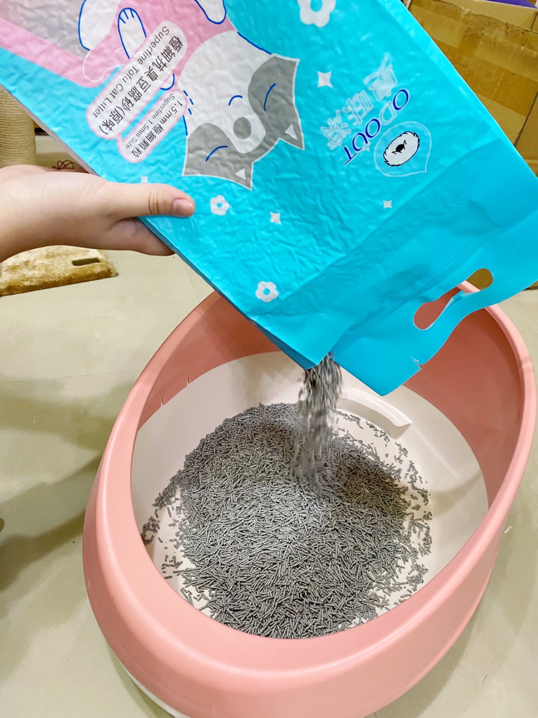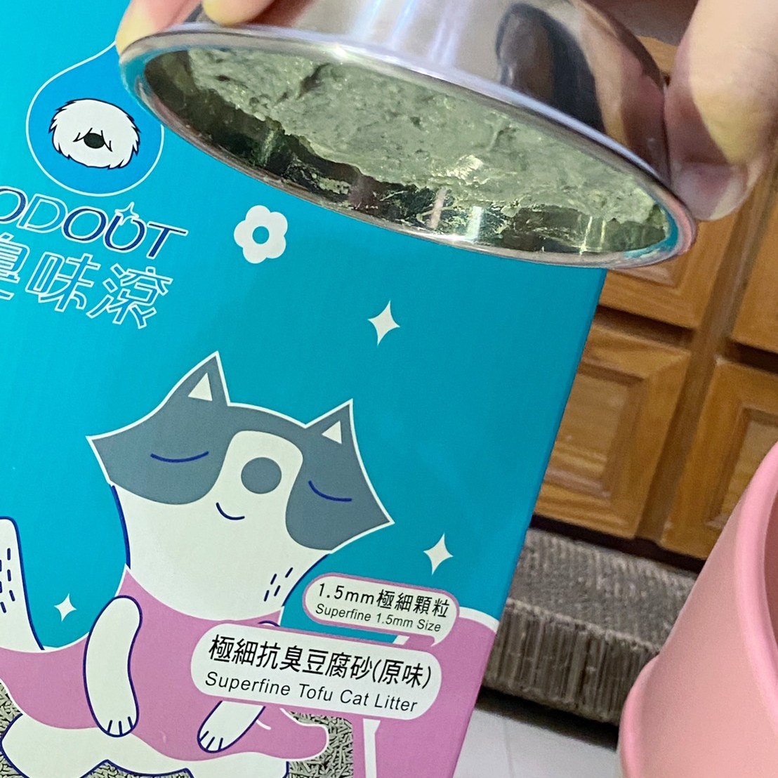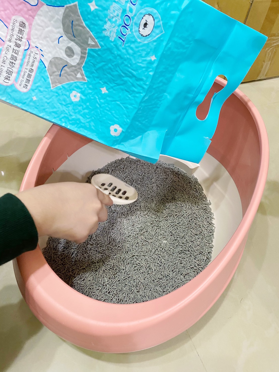 收到後立馬手刀換上【臭味滾】極細豆腐貓砂來試試,大約倒4~6公分的厚度,
