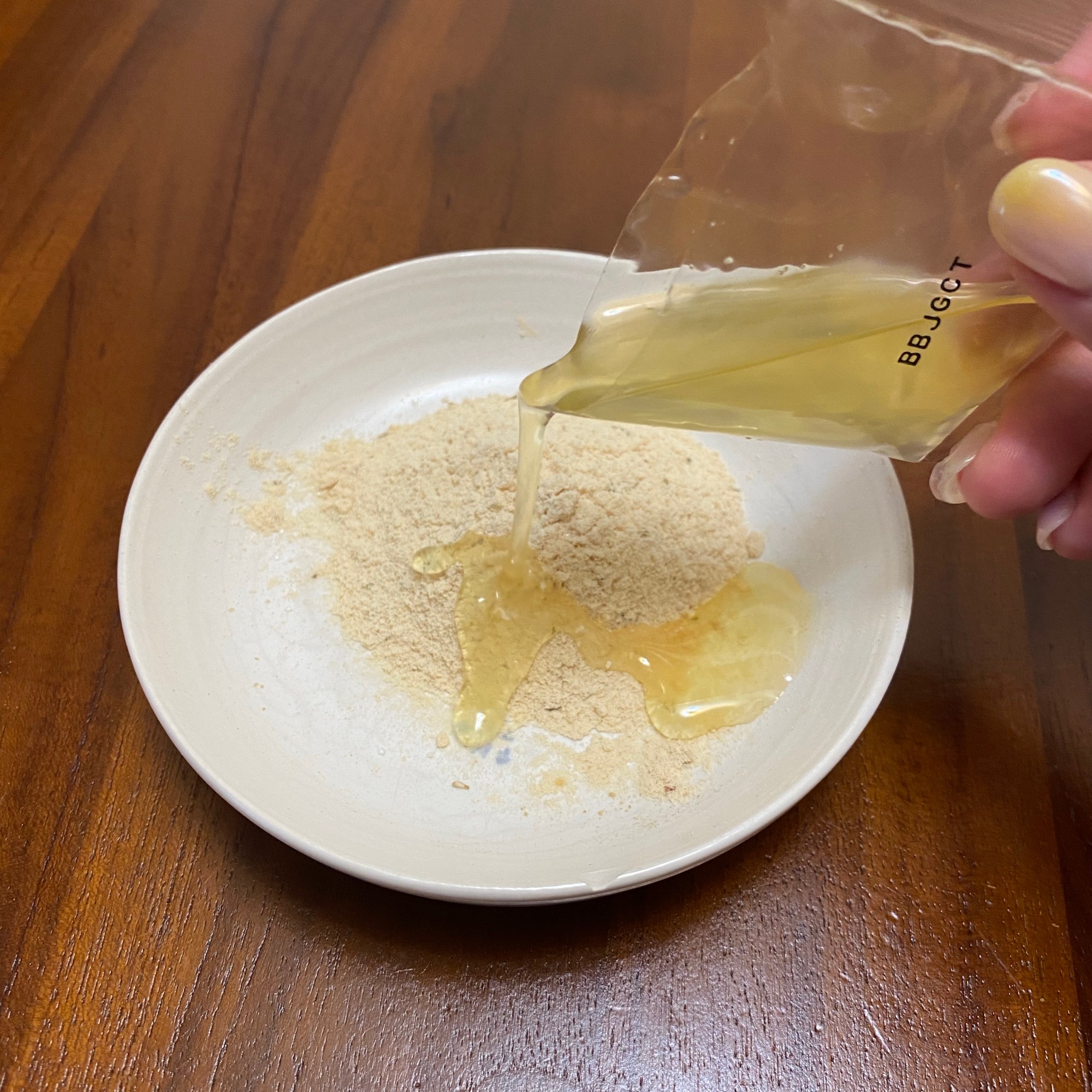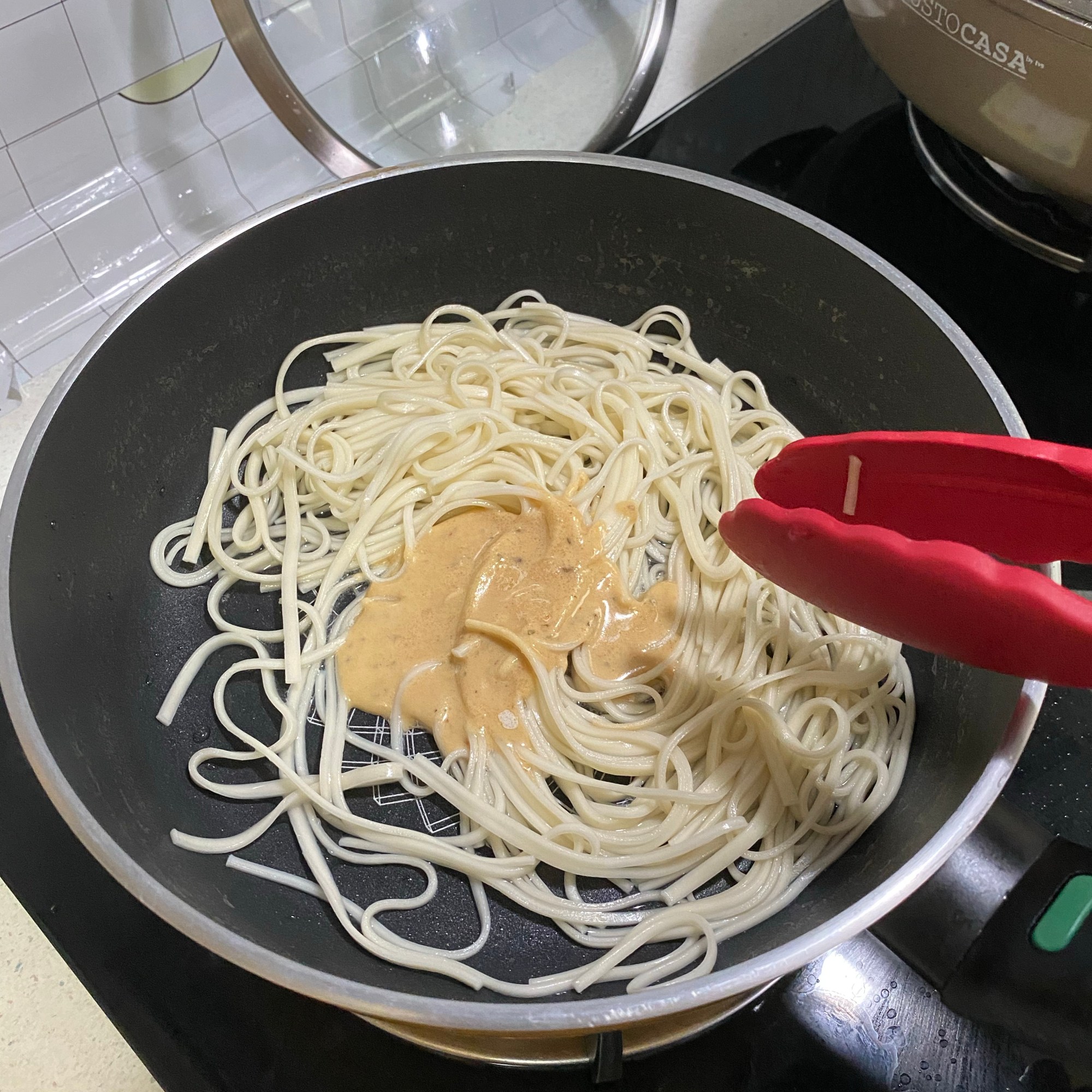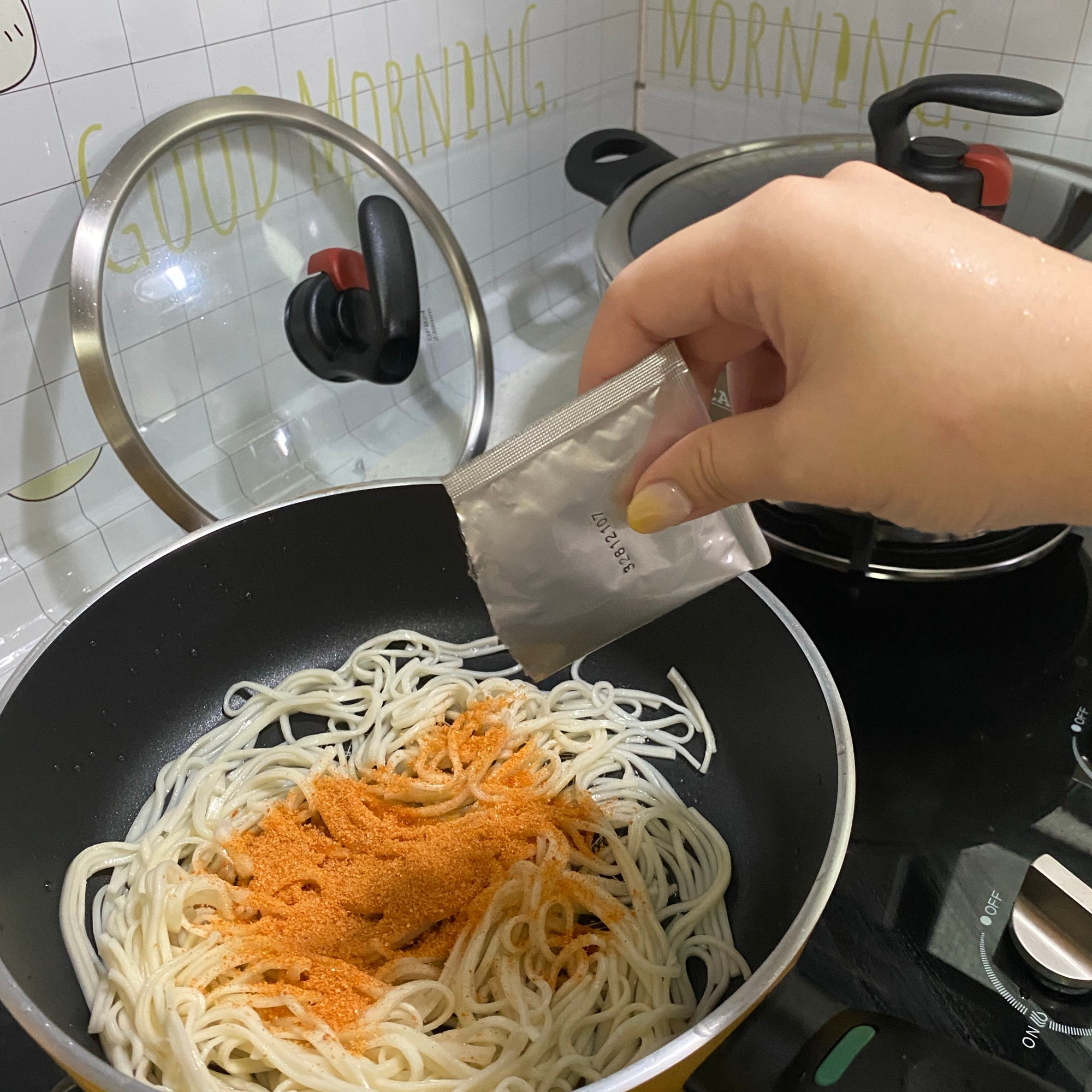 前面兩個口味我都是直接加粉、加油包然後再跟麵混在一起,這次我想說先把粉和油包混一起之後再加進去麵裡面,混完之後就會變得像醬包一樣的液體狀,不過我覺得這兩種方法我更傾向於第一種做法,用這種做法感覺醬跟麵才能比較均勻的拌在一起~