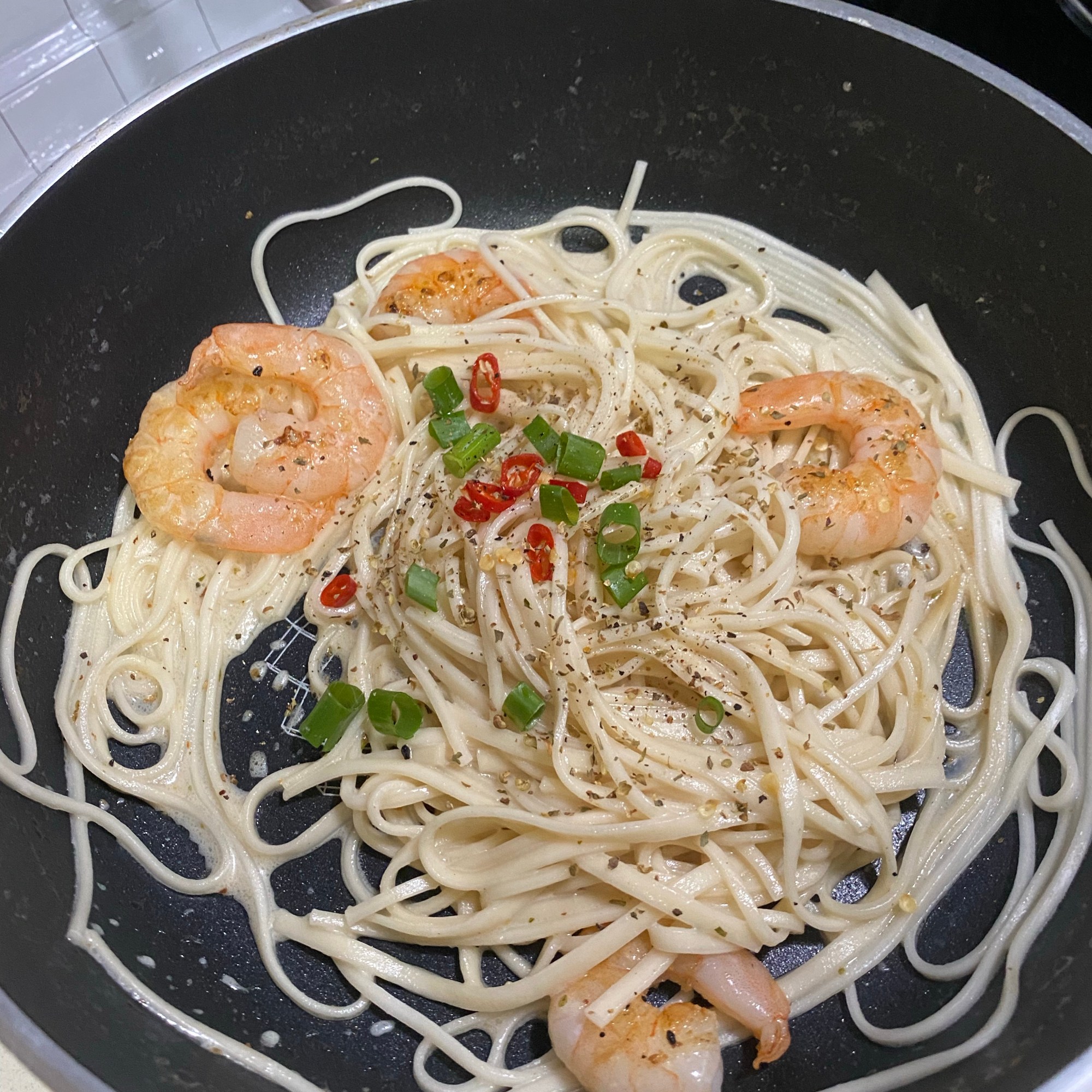 事實證明乾拌麵也是可以很有質感的吧!吃起來也不會很膩,是走清爽路線的白醬,蝦子果然是白醬的最佳夥伴,兩個加在一起吃超級速配,沒想到短短的10分鐘就可以吃到義大利麵🙌🏻超級方便!