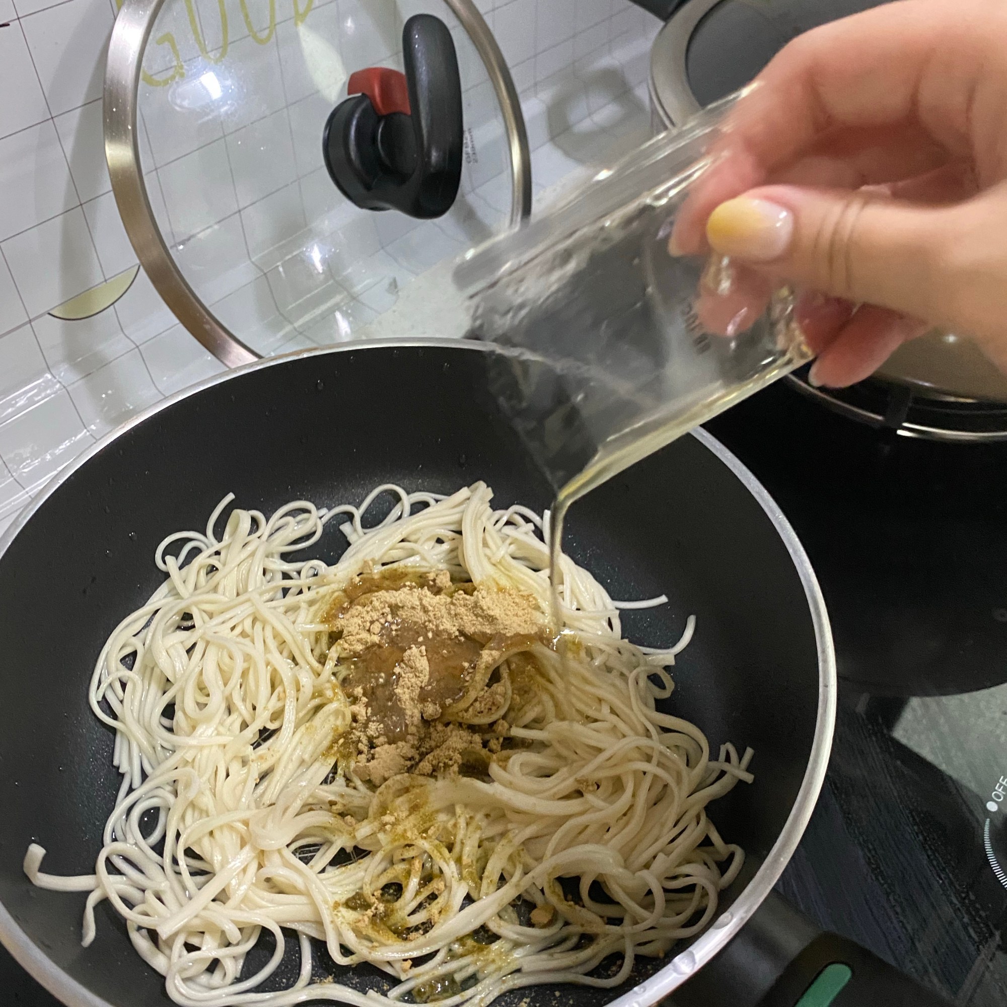 永豐拌麵的醬是粉包+油包,我是先倒粉包再倒油包,兩個的順序應該沒什麼關係,重點是麵煮好要倒麵水的時候記得要留一點,這樣加醬的時候才不會乾到拌不開~