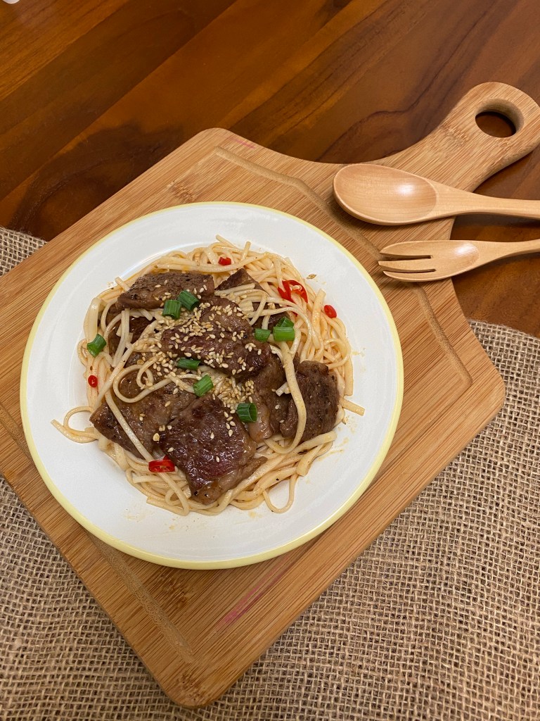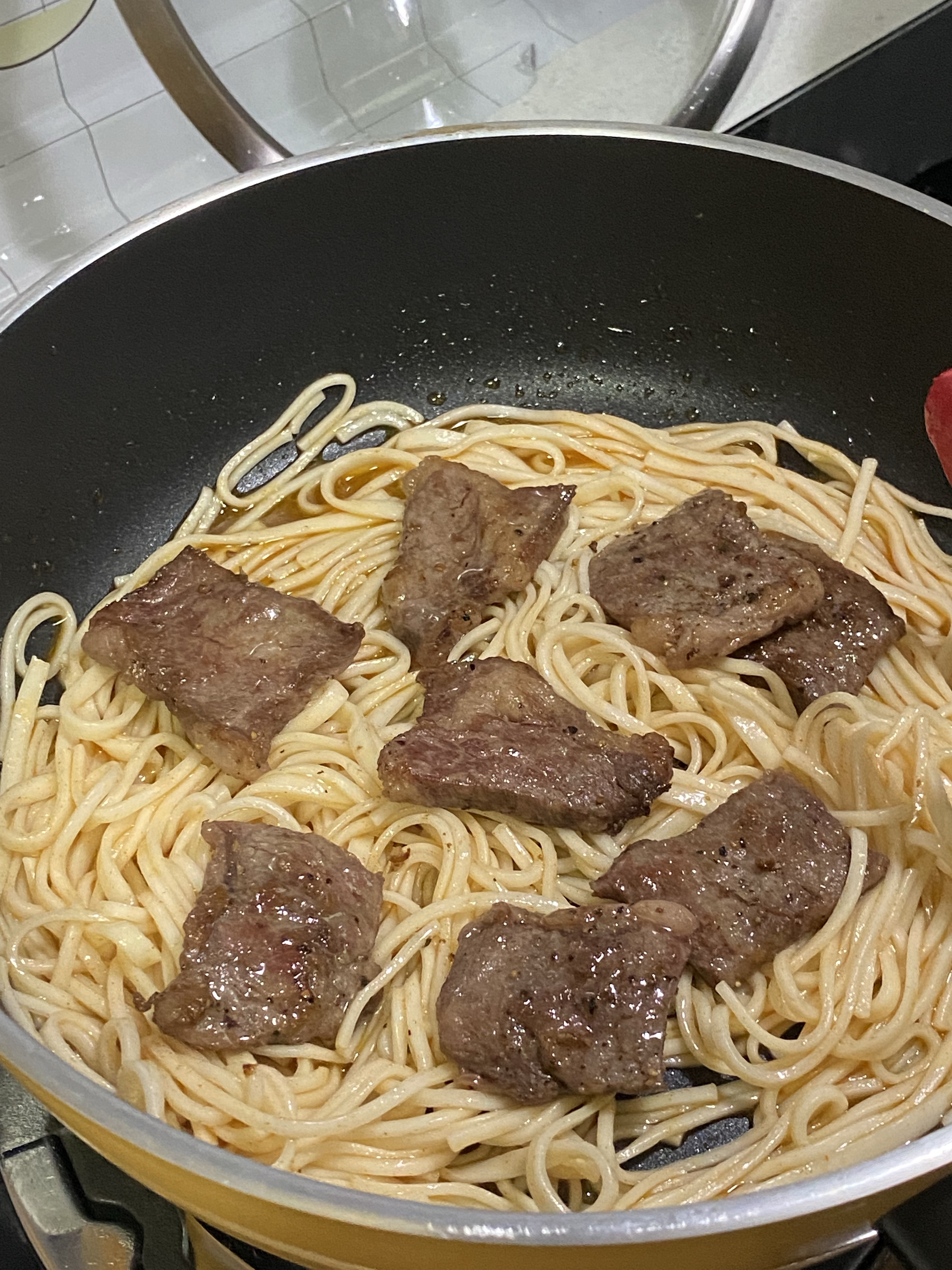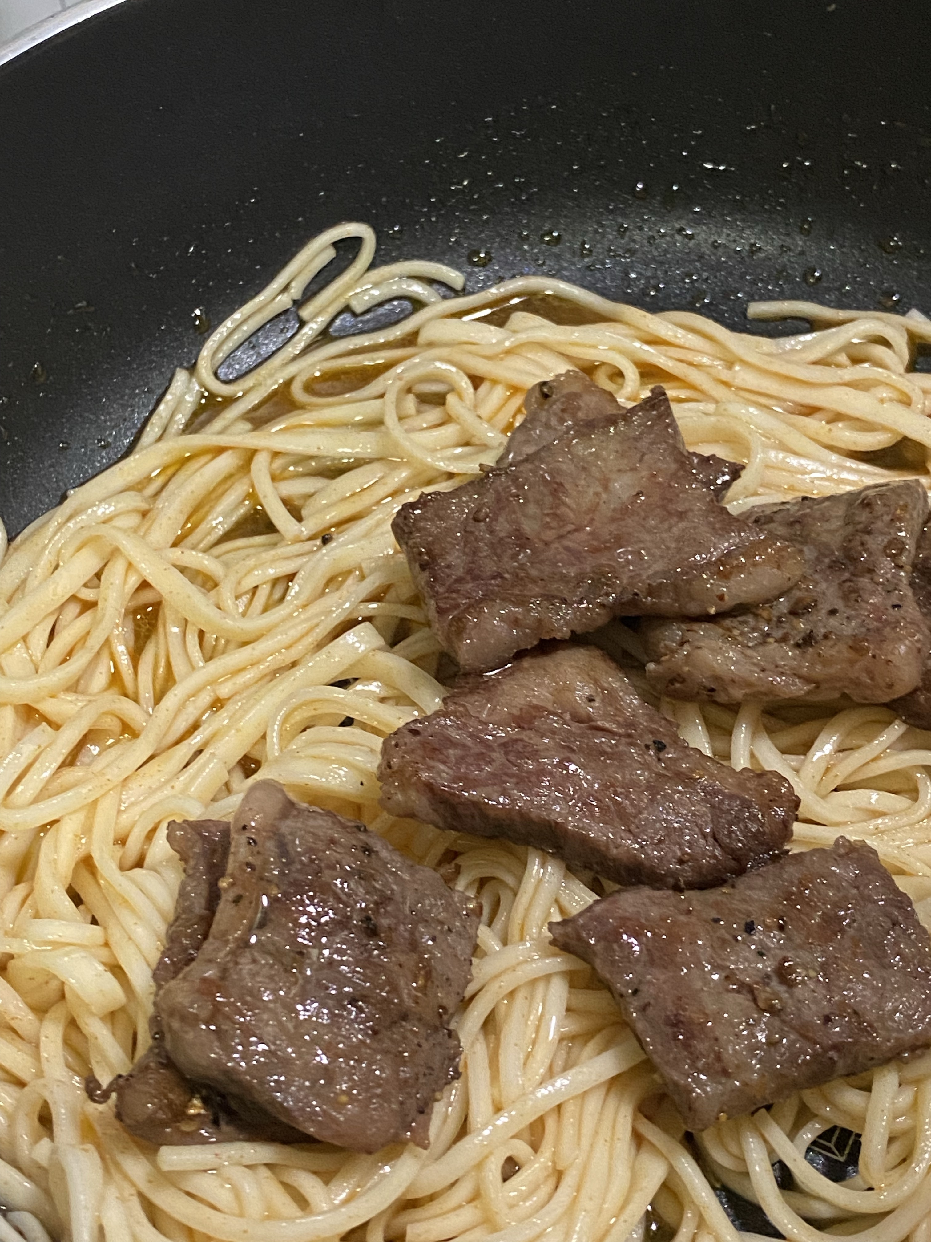 加入煎好的牛小排~在麵裡面拌均勻,再撒一點蔥、辣椒末增加一點色彩,這樣就完成囉✅