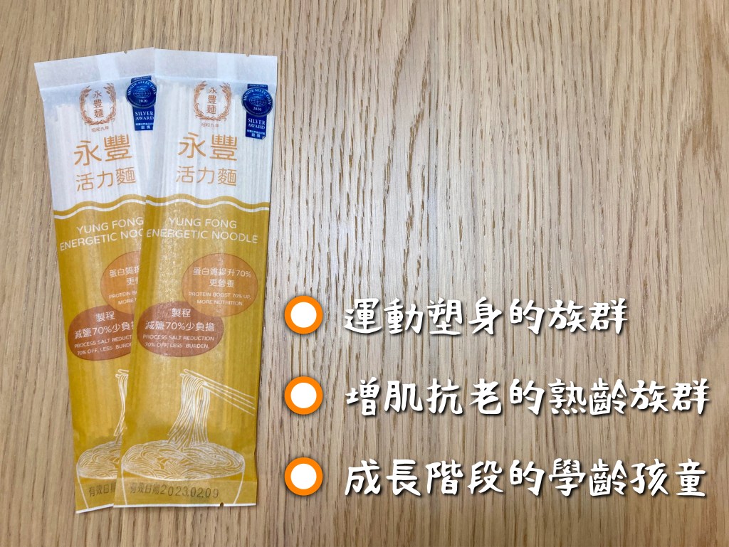 2020他們推出永豐活力麵,裡面結合了小麥粉、優質濃縮米蛋白以及來自愛爾蘭的藍鱈魚超高規格蛋白等精選原料,再經過特殊製程與多道延壓後烘製而成的麵條。
