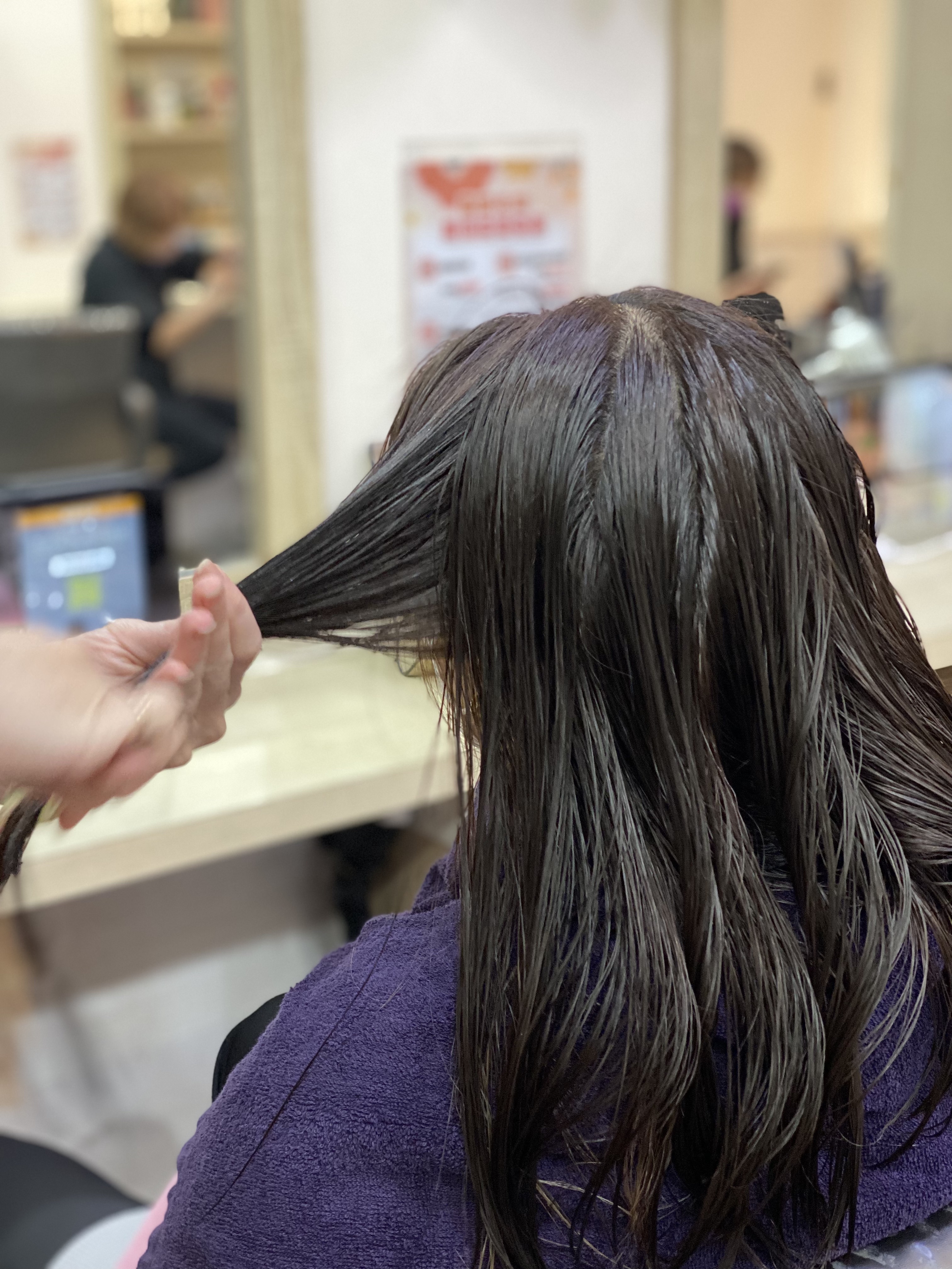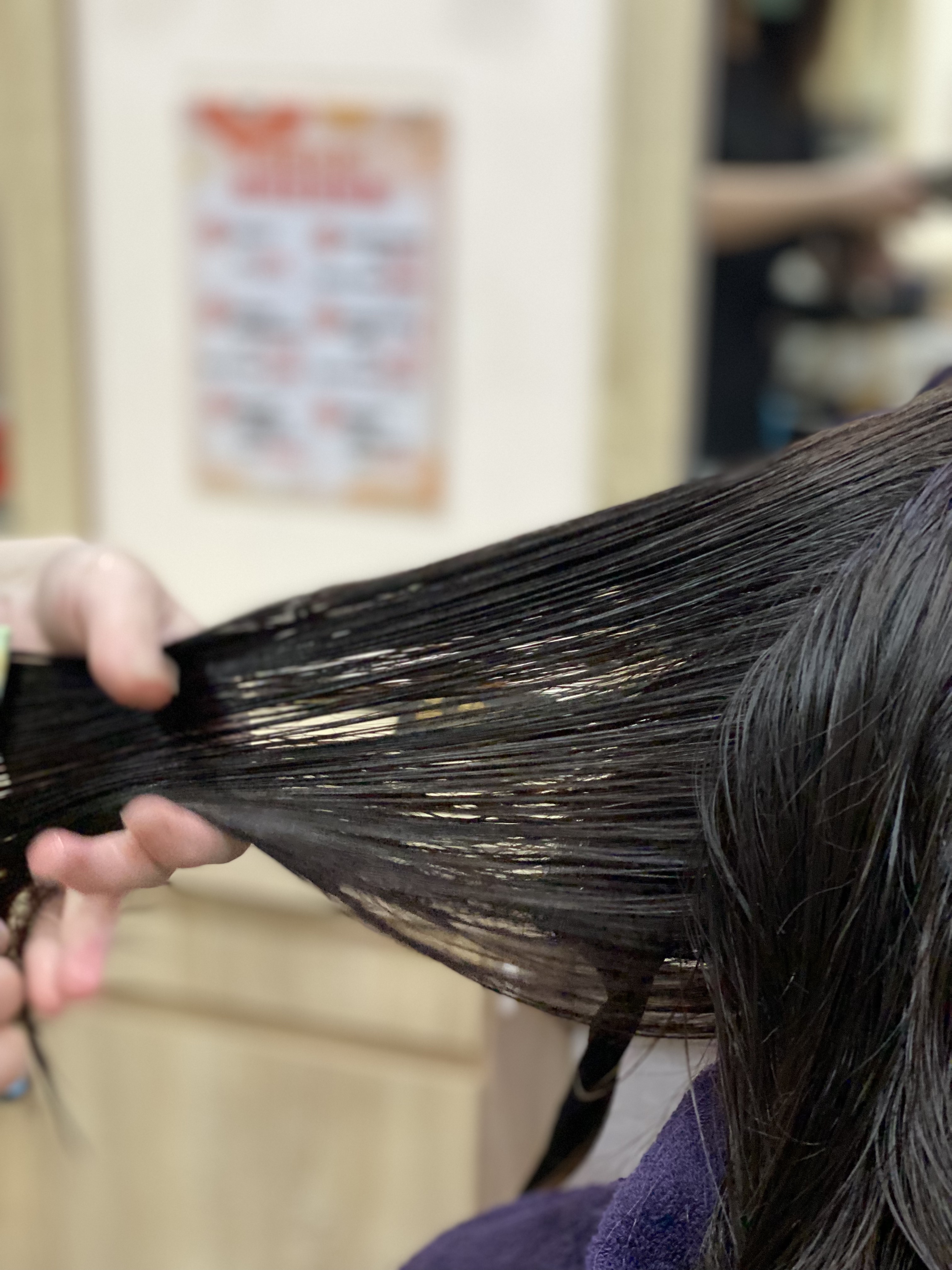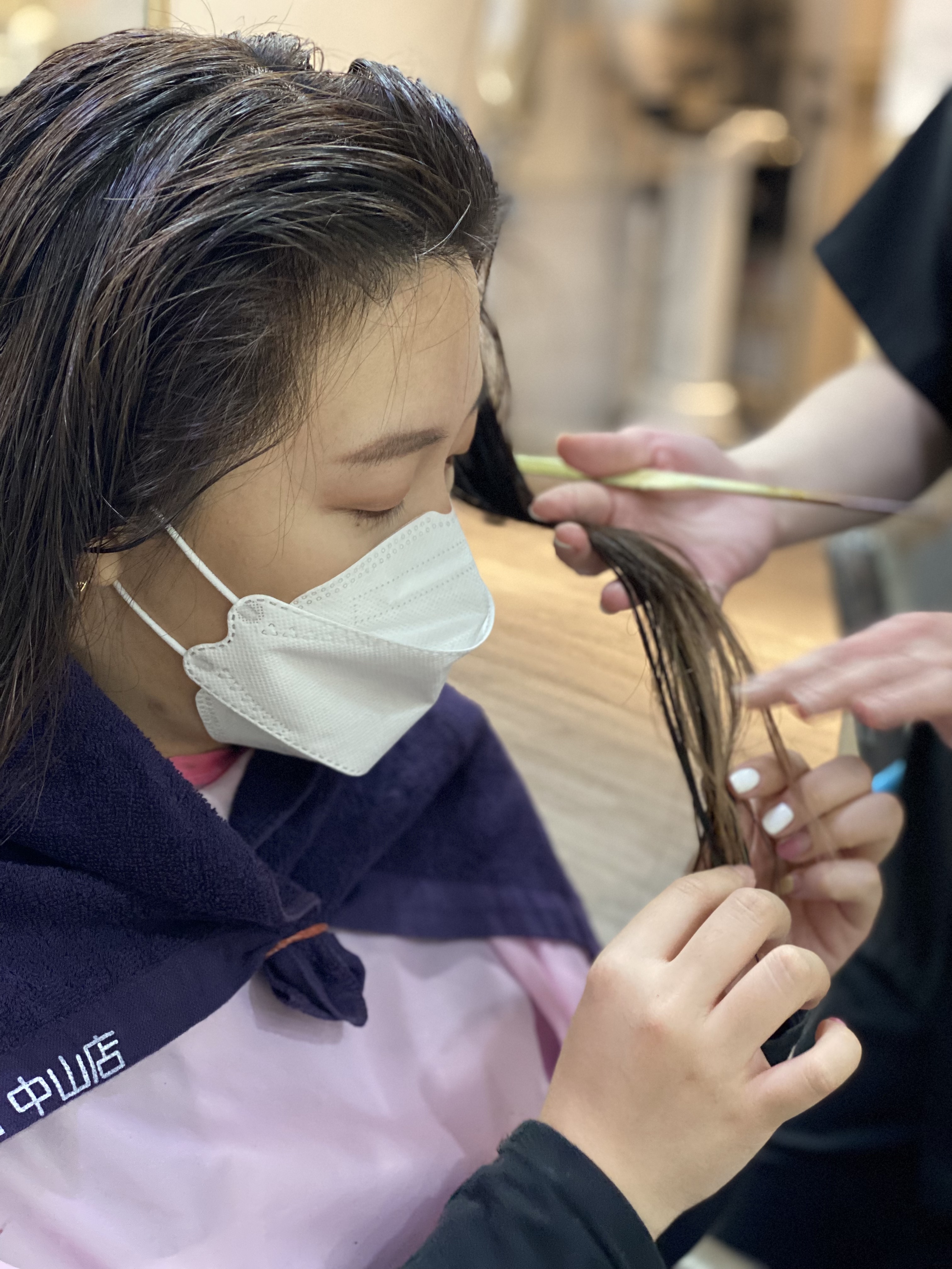 設計師有特別提醒我們,第一道手續結束之後頭髮會呈現澀澀的手感,叫我們不用擔心,下一道完成之後就會完全不一樣了!