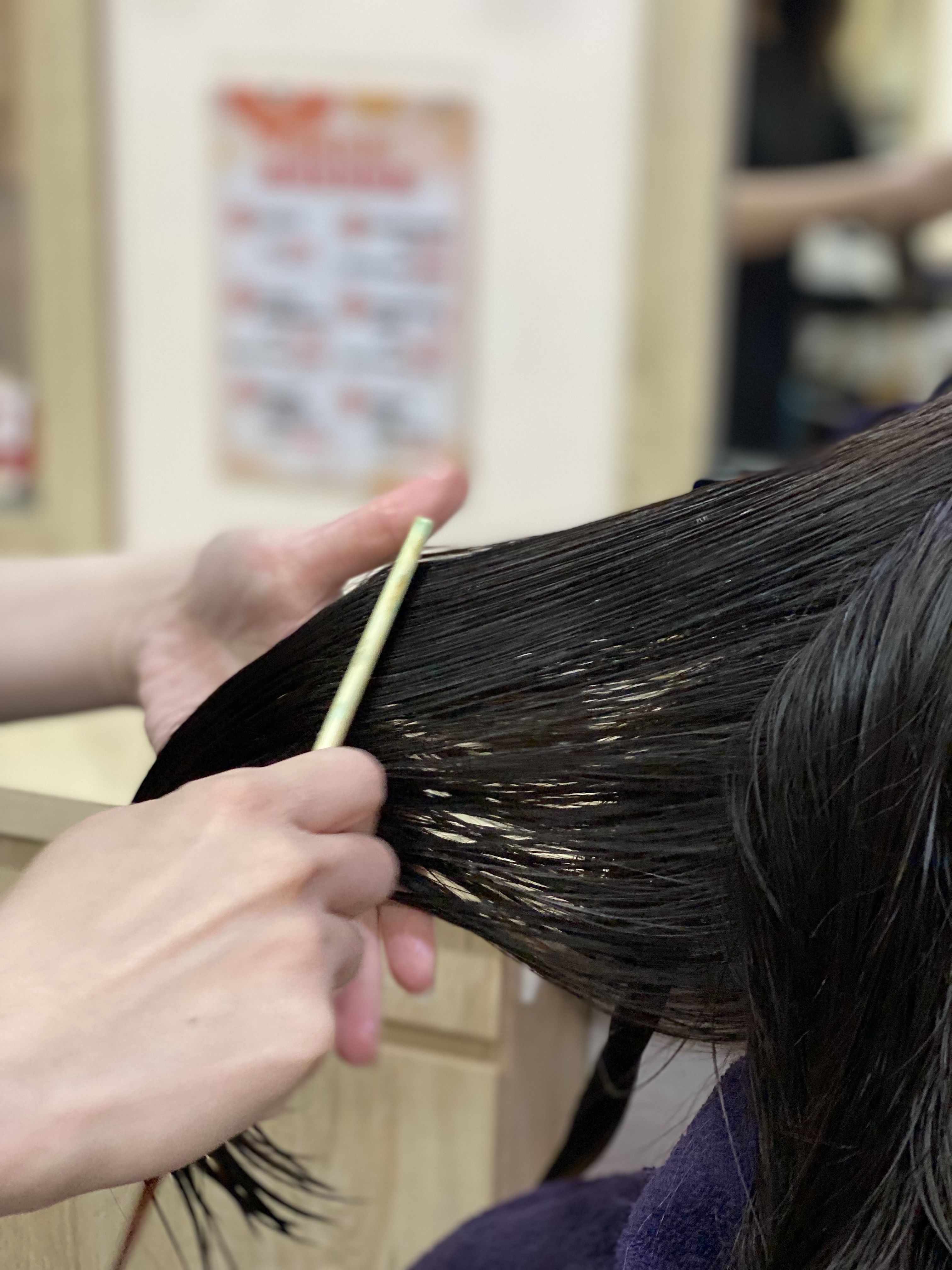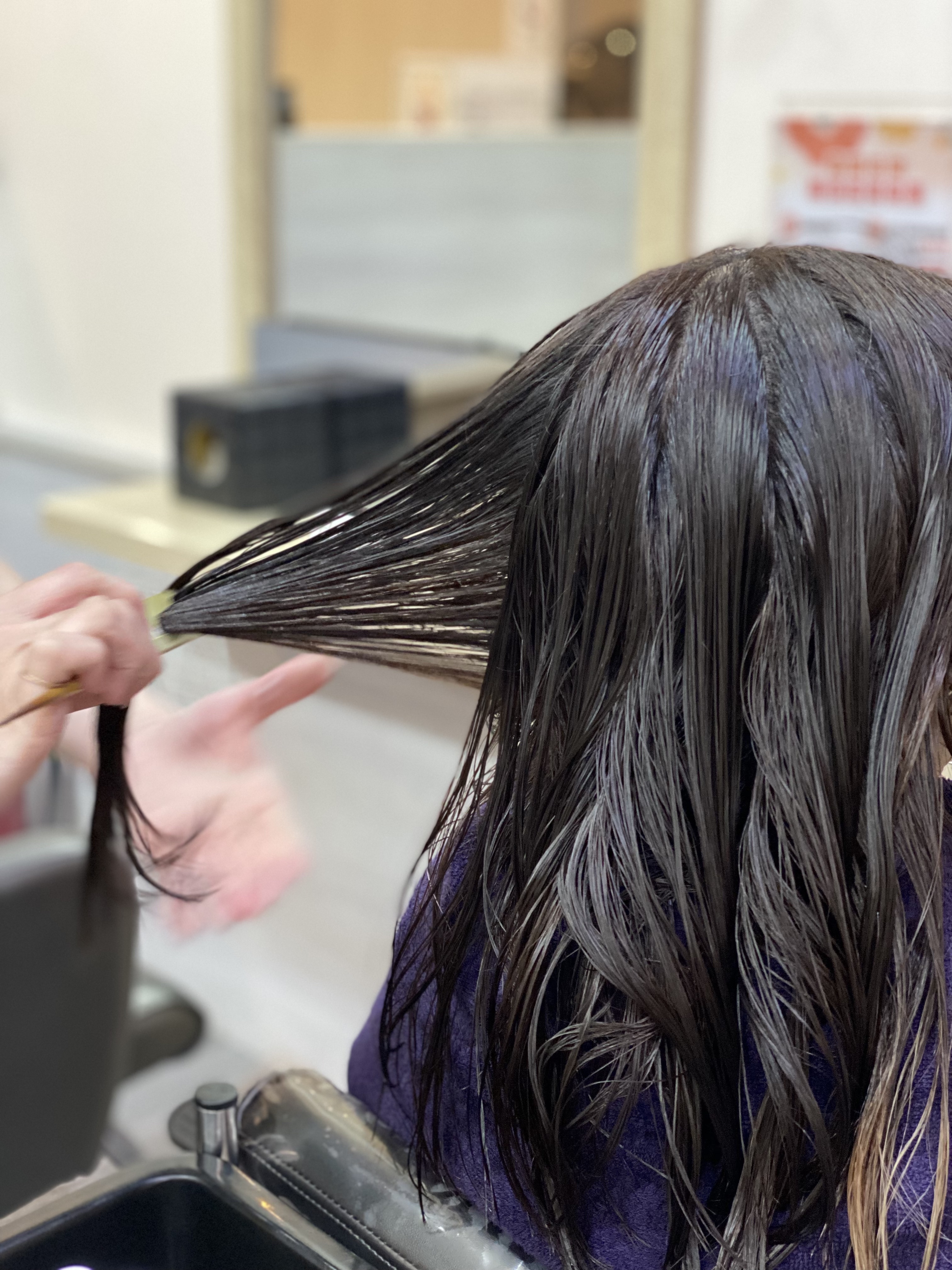 一樣是利用梳子把油均勻梳到頭髮上,結束之後設計讓我摸一下比較剛剛的不同,果然上完這層之後剛剛澀澀的手感已經消失了,取而代之的是油潤的質地🥳