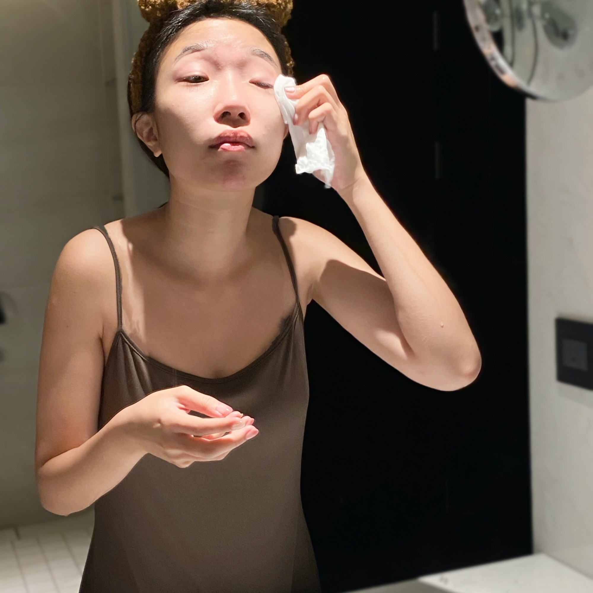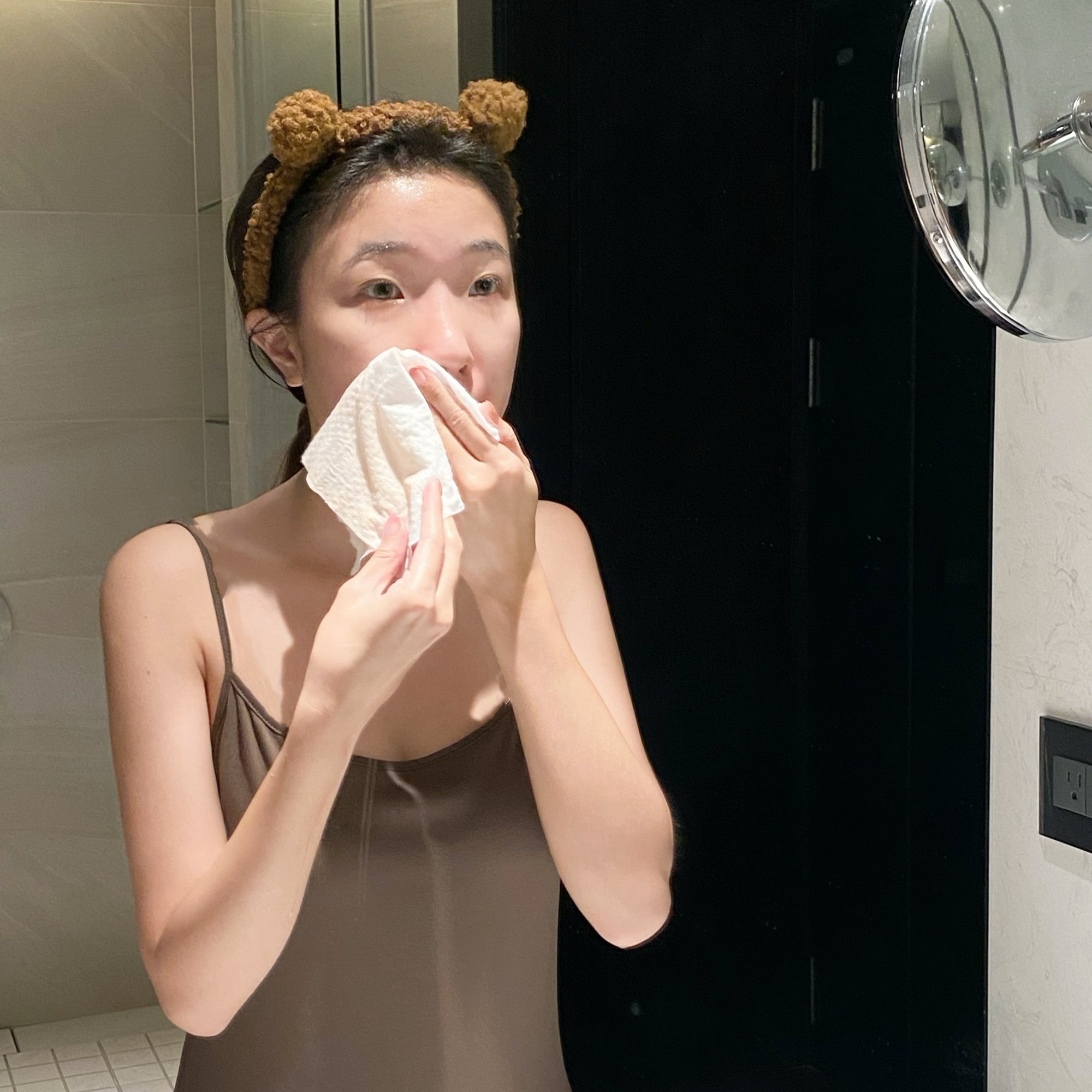 娜編習慣使用洗臉毛巾輔助把殘妝擦掉