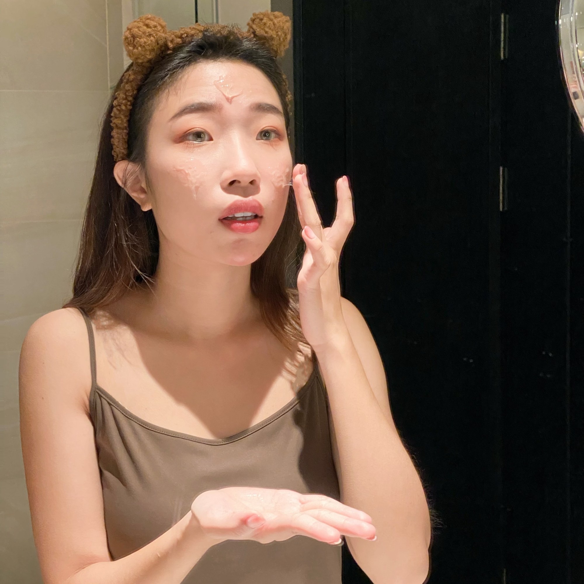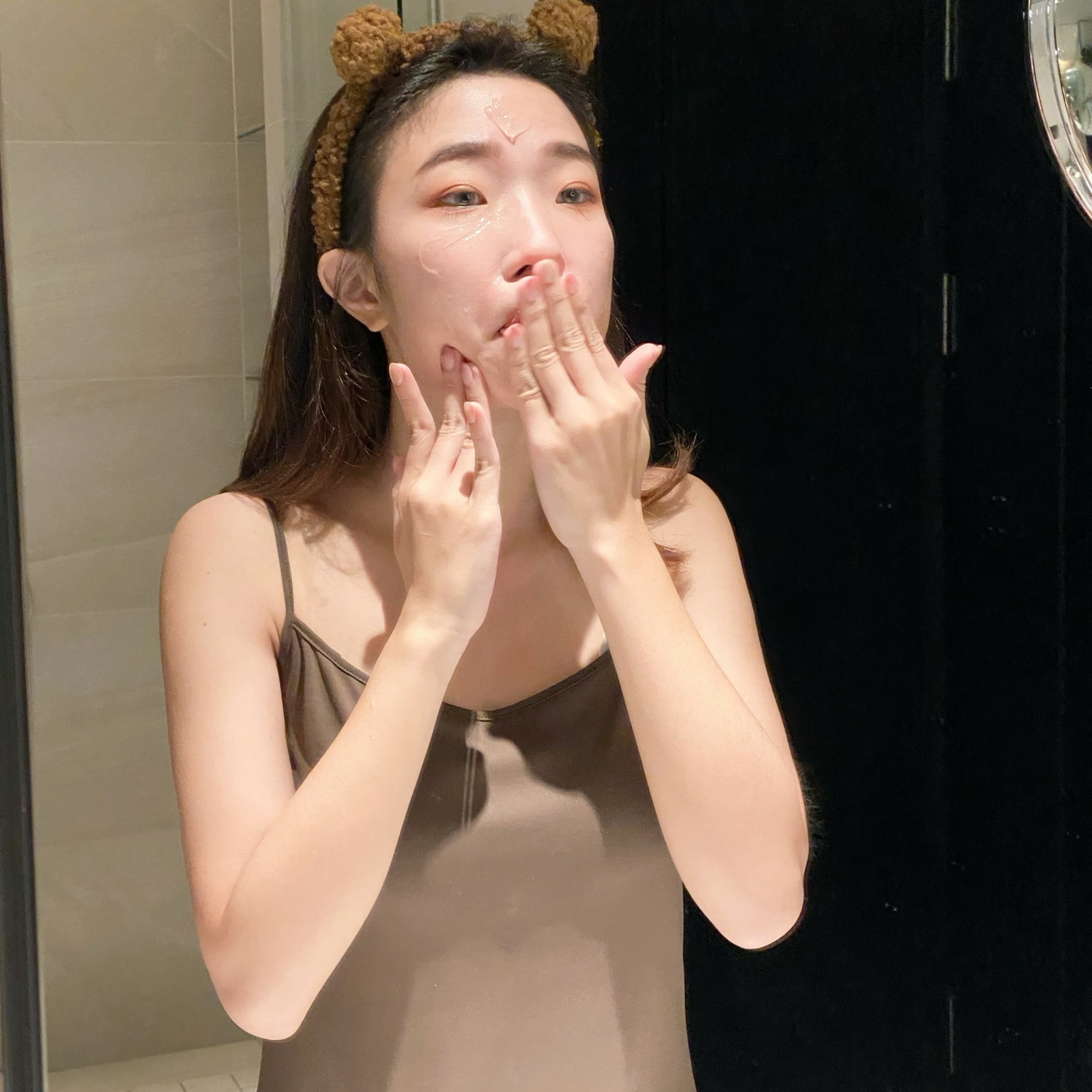 娜編習慣先將【Tres特莉絲】純淨無油卸妝蜜塗在額頭、下巴及臉頰