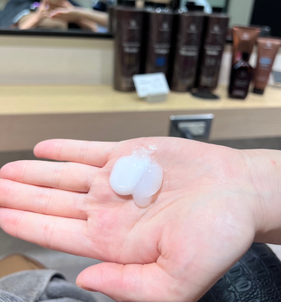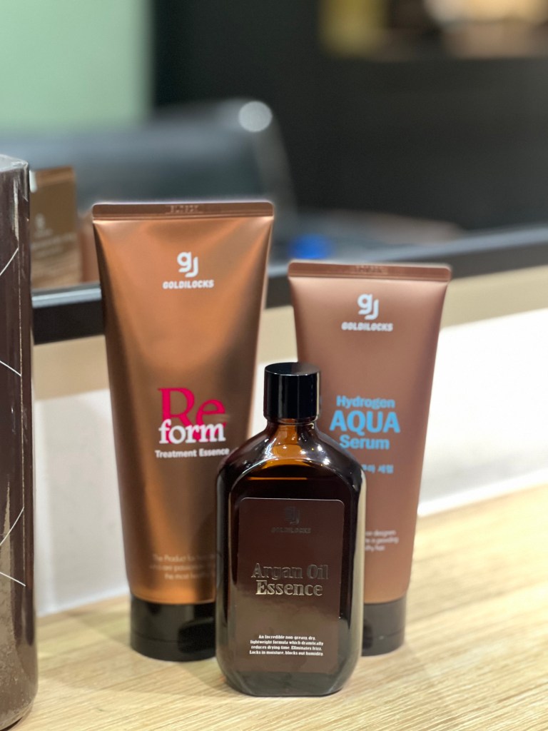 最後吹髮造型前,擦上金韓今的保濕精華乳打底,跟抗毛躁的抗熱霜
